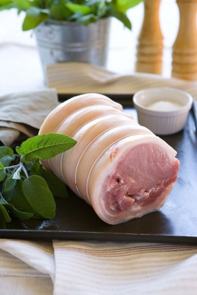 The prime loin with the bones removed, rolled and tied. Very succulent, easy to cook and to carve.